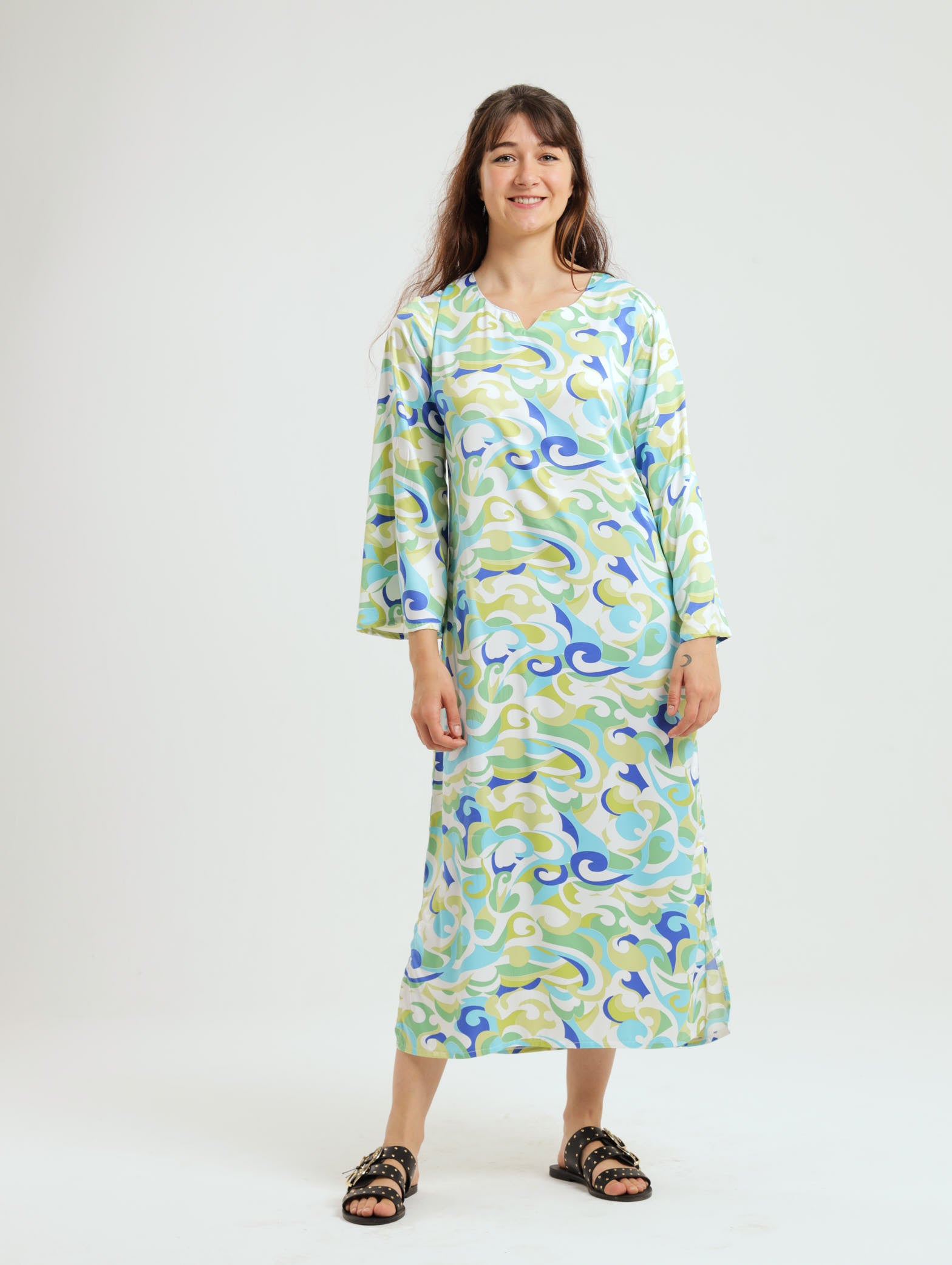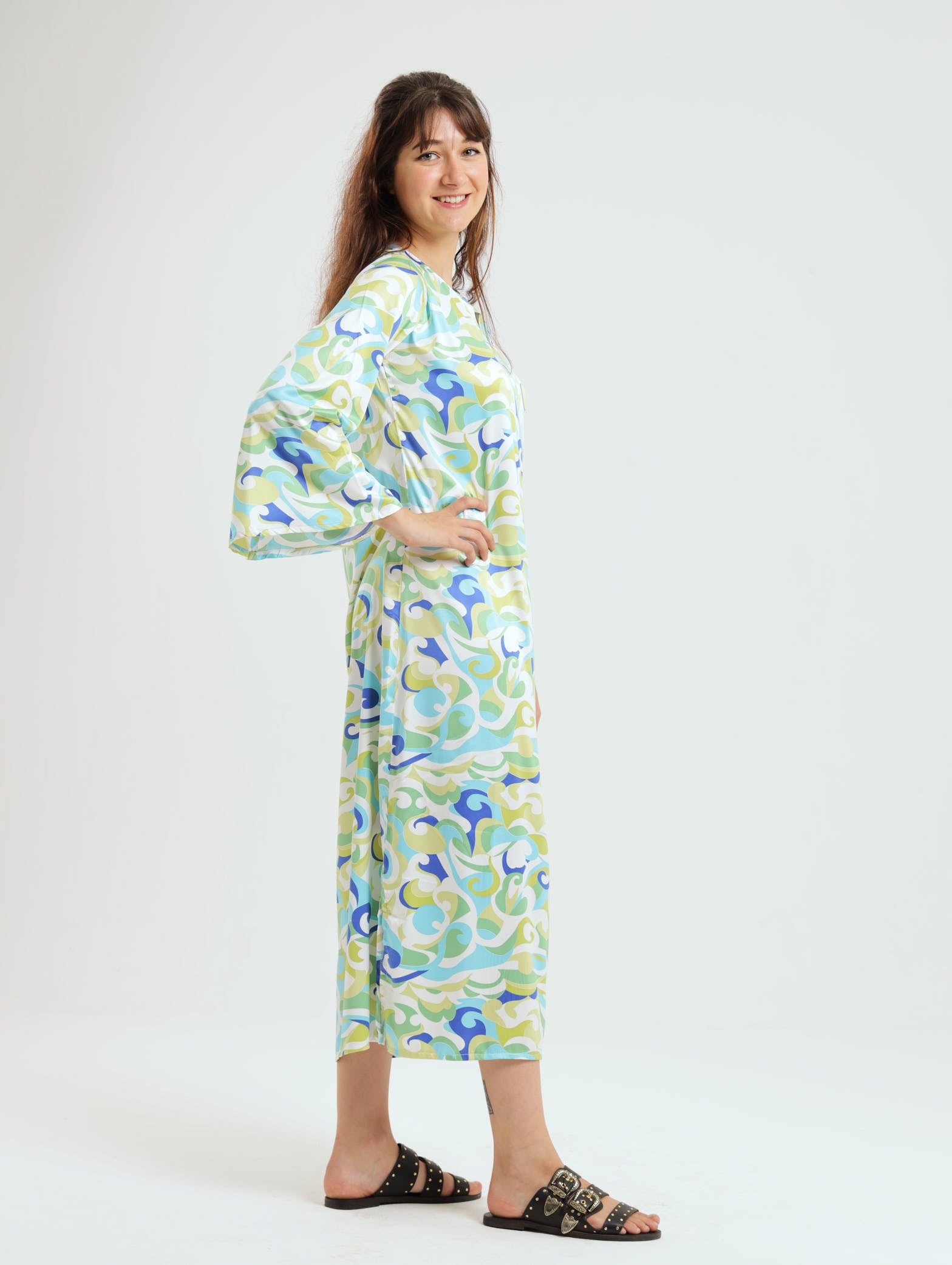 Add some FUN to your wardrobe with the Wattle kaftan! A long kaftan with a flowing, flattering silhouette crafted in silky satin fabric with regal bell sleeves. Make a statement in the beautiful bright colours and exotic shape of the Wattle kaftan!